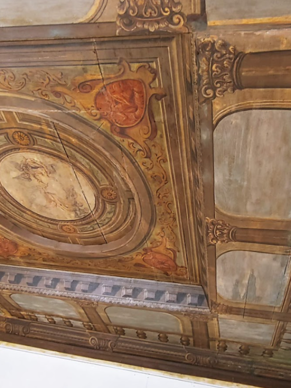 Le premier étage contient des pièces qui sont vraiment remarquables d'un point de vue artistique. Elles ont dû accueillir les hôtes illustres de la villa voisine, car on y trouve de précieux plafonds en bois, décorés de trompes-l'œil élaborés, de perspectives architecturales et d'armoiries héraldiques. Il est possible qu'ils aient été partiellement ou entièrement réalisés par Callegari, qui était également peintre. Dans le plus grand, en saillie, le long du périmètre, il y a l'illusion d'une balustrade maladroite qui court tout autour dans une perspective centripète très chiche. Le centre en retrait de l'imposant pont de bois, en revanche, arbore deux décorations luxuriantes dérivées du motif de la rosace centrale.